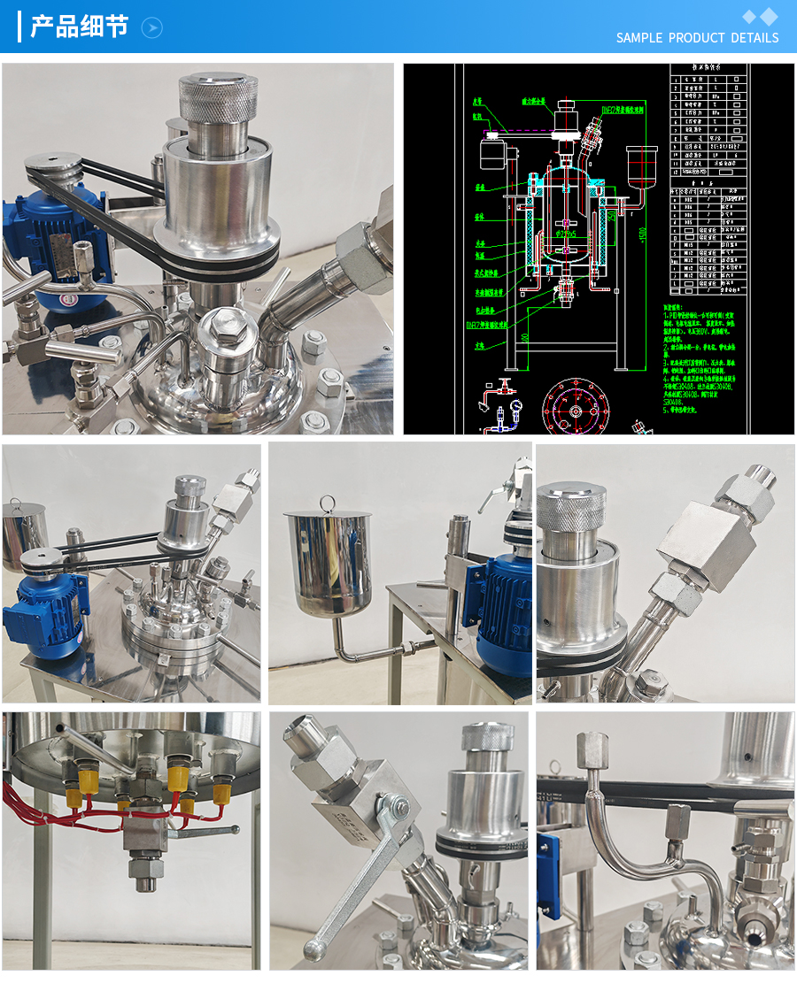 其他附件 如果用戶在釜蓋、釜體開口、內(nèi)部結(jié)構(gòu)、壓力高低、攪拌槳葉、及增加其他輔助裝置(如冷凝回流裝置、冷凝器、恒壓加料罐、接收裝置)等有特殊要求,可完全按用戶的要求加工制造